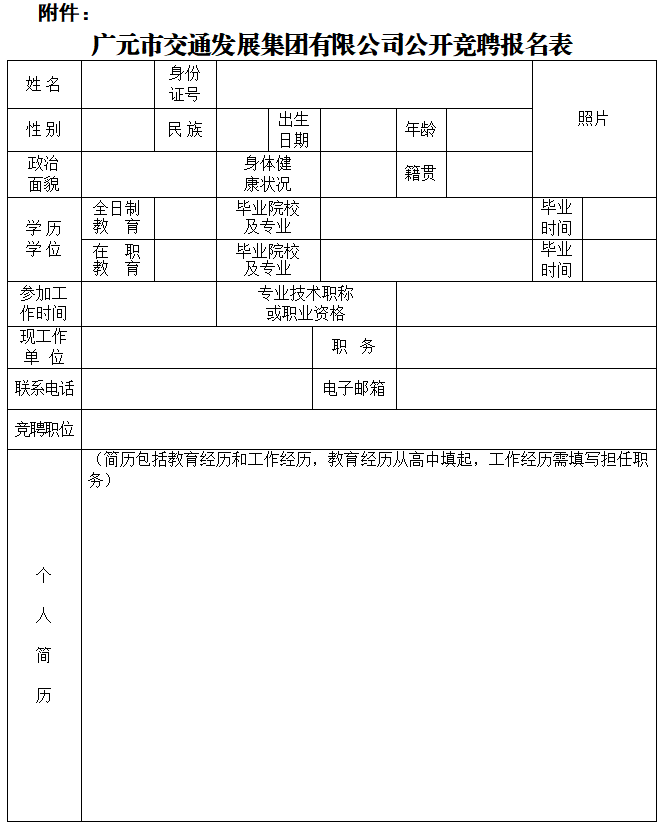 附件:廣元市交通發(fā)展集團(tuán)有限公司公開(kāi)競(jìng)聘報(bào)名表